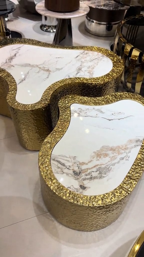 The design features sleek golden plated metal frames that create a refined luxury appearance. The elegant geometric structure gives the tables a modern sculptural feel. As a result, the tables do not function only as furniture but also act as decorative objects that enhance the room’s overall aesthetic.