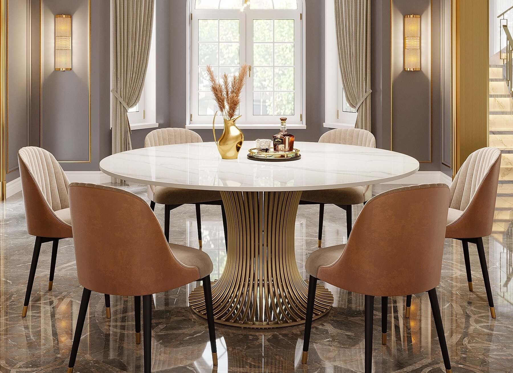 Investing in the Meridian Round Dining Table Set is more than just purchasing furniture; it's an investment in your lifestyle. It’s choosing to create a space that inspires, impresses, and comforts. Imagine hosting brunch bathed in morning light, the gold base shimmering, or a candlelit dinner where the marble reflects a soft, warm glow. This set is versatile enough to complement a variety of interior design styles, from contemporary and minimalist to transitional and even art deco-inspired decors.