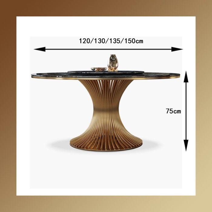 The true artistry of the Meridian table, however, lies in its extraordinary base. A sculptural marvel, it features a unique pedestal design composed of gracefully arcing, brushed gold spindles. These vertical lines converge and diverge with a rhythm that evokes the sophisticated structure of architectural meridians, creating a captivating visual that is both strong and elegant. This golden foundation doesn't just support the table; it elevates it, reflecting light and adding a radiant warmth to your dining space.