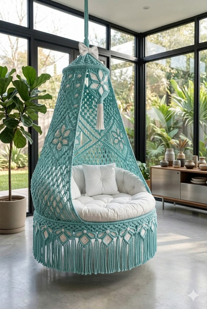 Homeowners in cities like Delhi, Hyderabad, Kochi, Pune, and Chennai often install macrame swings in living rooms, balconies, and terrace lounges to create a unique seating area.