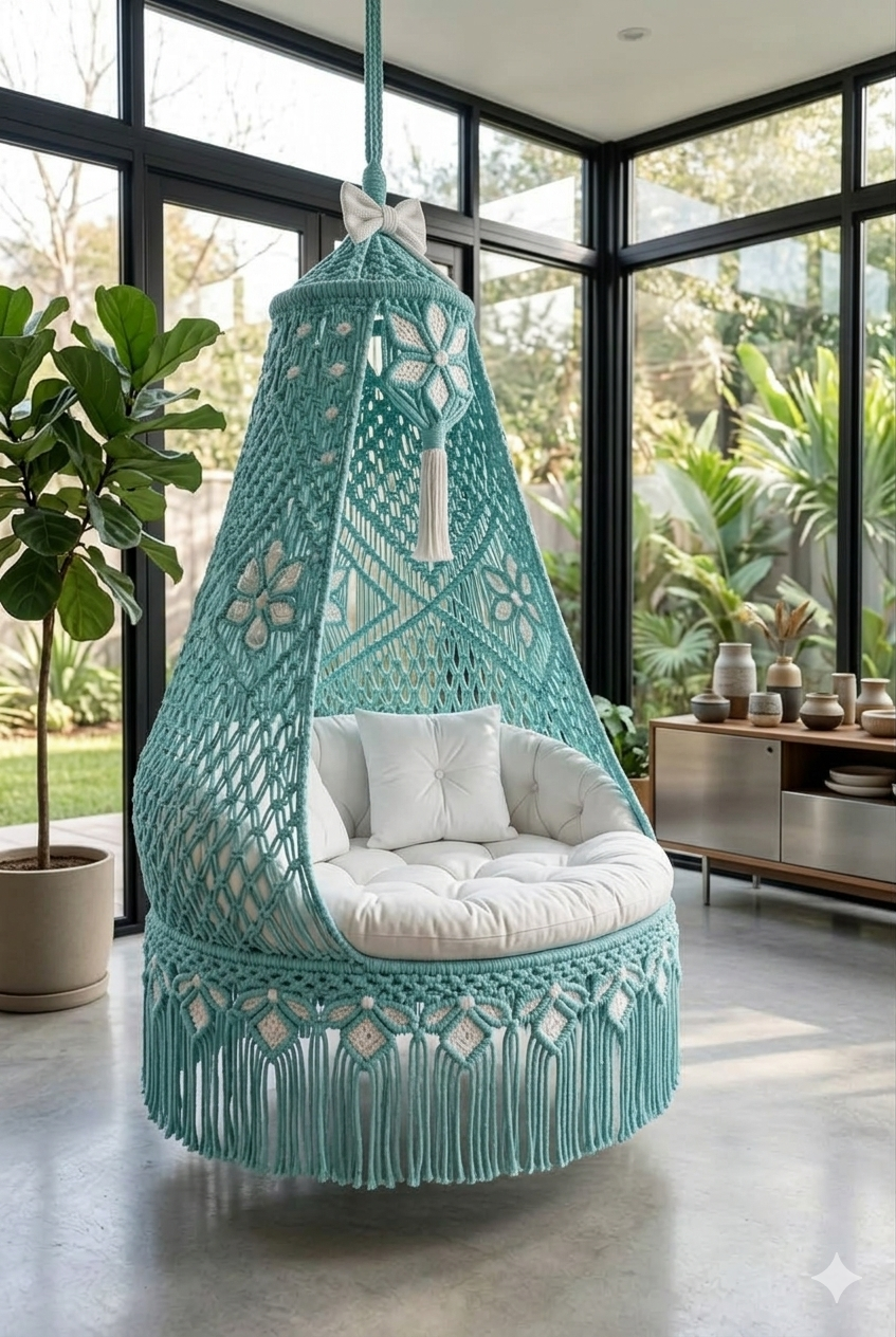 Interior designers across India are increasingly recommending macrame swings for modern homes. The reason is simple. These swings combine handcrafted beauty with practical comfort. Unlike ordinary chairs or sofas, a hanging swing creates movement and visual interest in a room.
