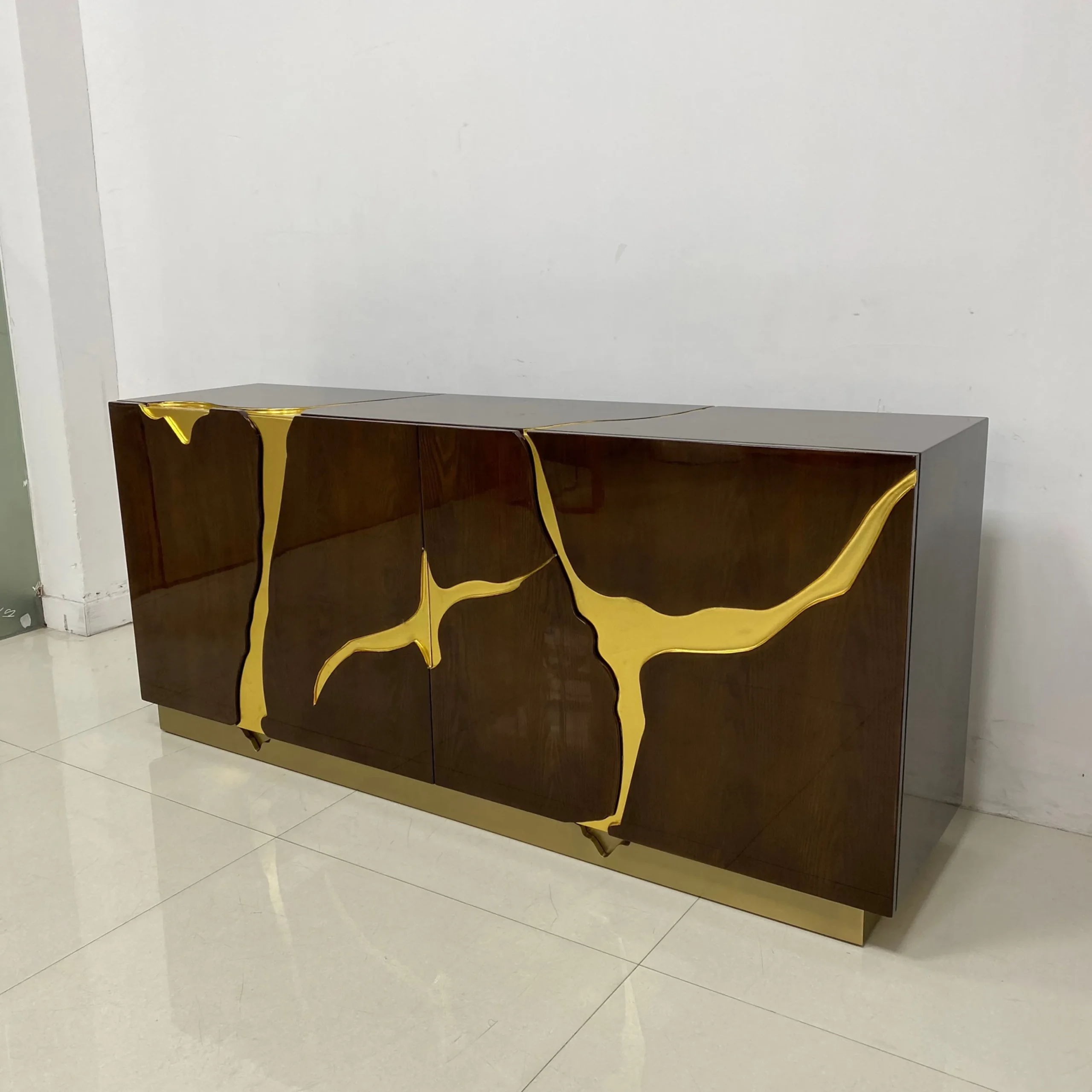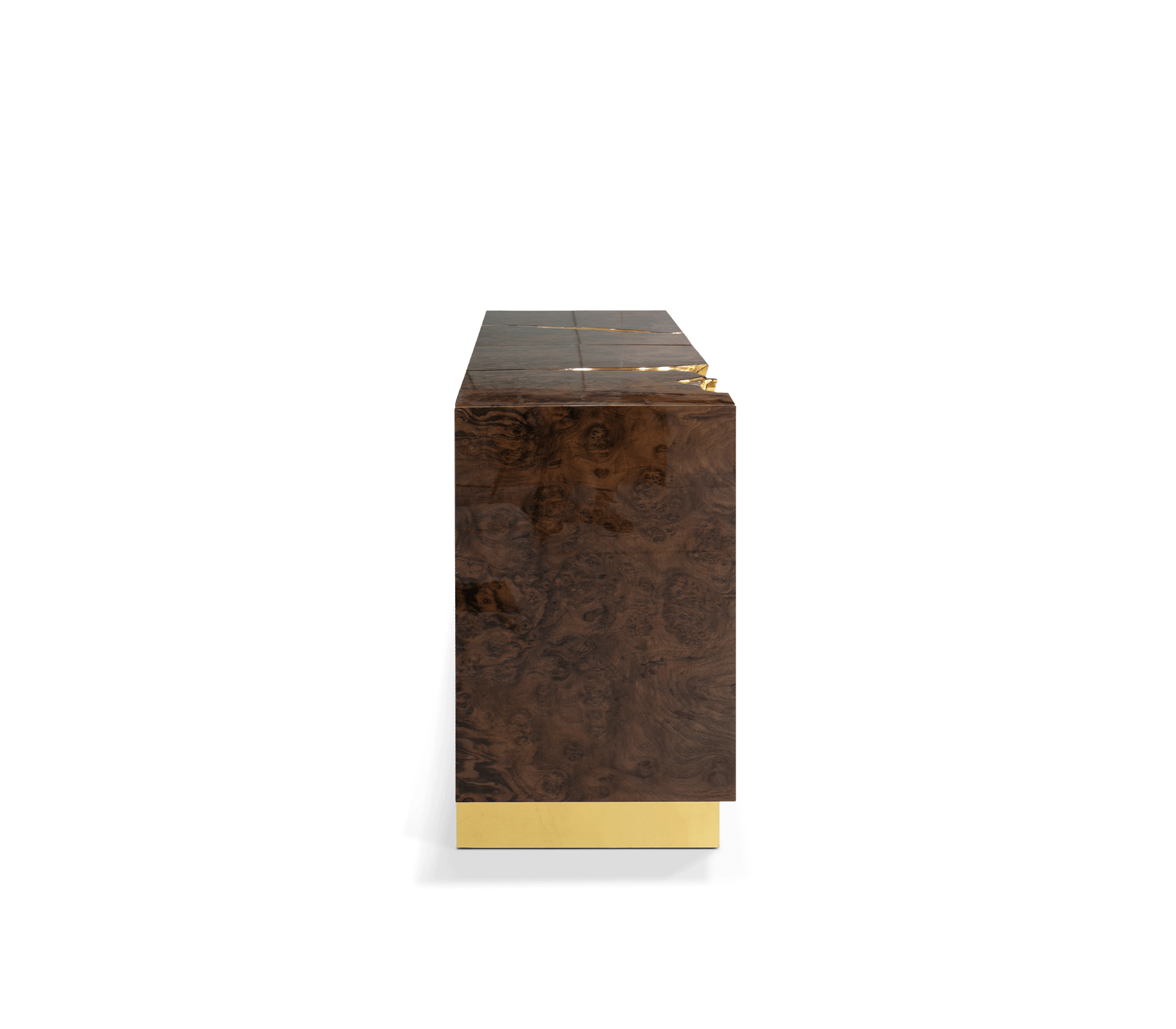 The design of the Walnut Lapiaz Sideboard draws inspiration from natural stone cracks filled with molten gold. This creates a dramatic contrast between organic texture and refined luxury.
